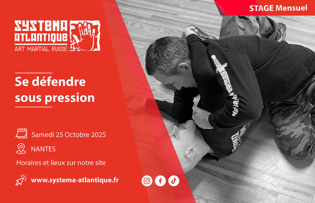 Systema atlantique organise et anime des stages de systema thématiques à Nantes durant toute la saison sportive, de septembre à juin. On parle de « stage mensuel ». Un stage d’une durée de 4h dédié à un aspect de la pratique pour découvrir le systema ou approfondir ses connaissances. Se déroulant à Nantes, les stages mensuels rassemblent environ 15-20 personnes/stage, un groupe de petite taille pour bénéficier d’une pédagogie personnalisée.